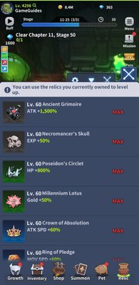 Summon and max out on all your relics! These are very powerful effects on all aspects of your game. Once you max out on a specific relic, you cannot summon any more of that same relic.