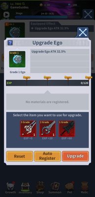 Therefore, it will cost 16 Grade-1 and 2 Grade-2 items to fully upgrade Ego 4.